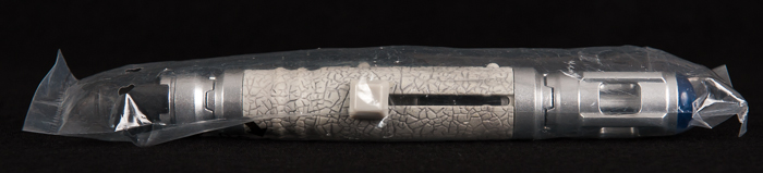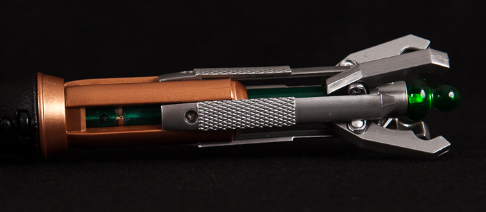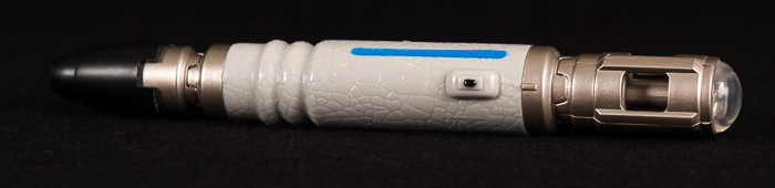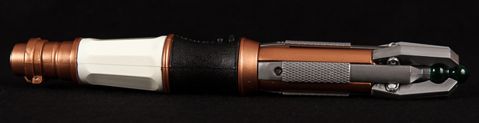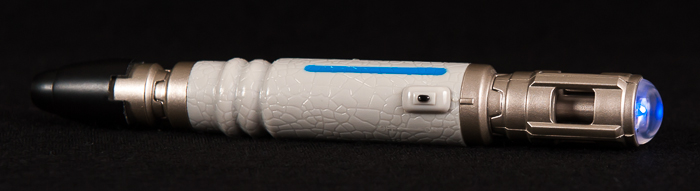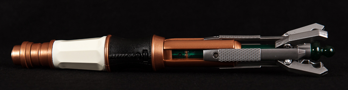 This faithful copy of the Doctor's trusty sonic device has spring loaded extending action , simply press a button on the side, to extend the head and open the claws. Pressing the other button activates the flashing LED light and four different sound effects . Flip open the cap at the end of the Screwdriver to reveal an additional light and sound effects button.