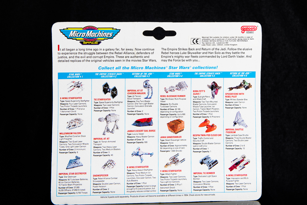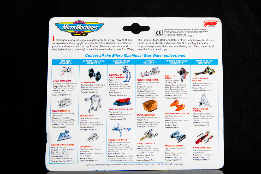 Approximate size of each vehicle is 1.5 inches long. Includes TIE interceptor, Imperial AT-AT, Speeder Bike with Rebel Pilot, Bespin Cloud City, Imperial Star Destroyer, Imperial Probot, Speeder Bike with Imperial Pilot, Mon Calamari Rebel Cruiser, Rebel Blockade Runner, Rebel Transport Ship, Imperial Shuttle Tydirium, Escape Pod, Landspeeder, TIE Bomber, TIE Starfighter, Red Squadron X-Wing Battle Damaged, Millennium Falcon, Imperial AT-ST Chicken Walker, Super Star Destroyer, Stinger, Jawa Sandcrawler, Escort Frigate, A-Wing Starfighter, IG-2000, Darth Vader's TIE Fighter, Boba Fett's Slave I, B-Wing Starfighter, Virago, Y-Wing Starfighter, Bespin Twin-Pod Cloud Car, Lars Family Landspeeder, Swoop with Rider, X-Wing Starfighter, Jabba's Desert Sail Barge, Death Star II, Outrider, Snowspeeder, Mon Calamari Star Cruiser, Income T-16 Skyhopper and Hound's Tooth!