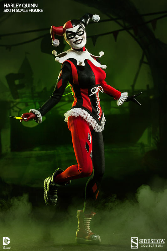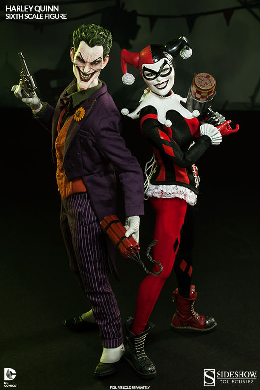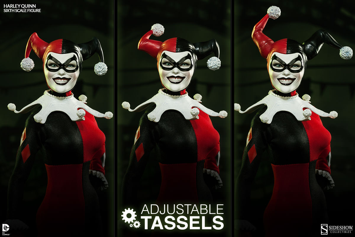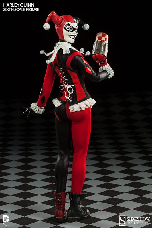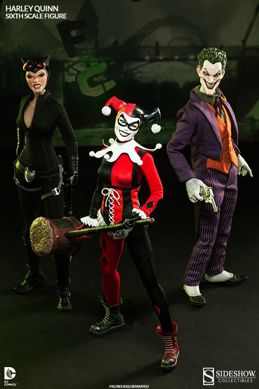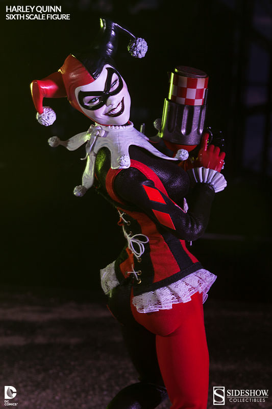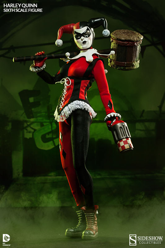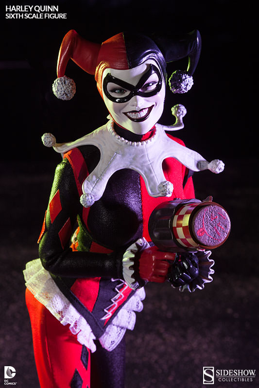 DC Comics' clown princess of chaos, the incomparable Harley Quinn, makes her long-awaited debut in Sideshow Collectibles' Sixth Scale figure line. Dressed to kill in a detailed fabric bodysuit, fitted corset and jester tights, the charmingly psychotic super villain is ready to hit the town, wreaking her special brand of havoc on the unsuspecting citizens of Gotham. Harley's packing a delightfully dangerous bag of tricks, including her signature wooden mallet, an oversized pop gun, and comically engraved brass knuckles, to name a few. Join the one and only Harley Quinn on her wonderfully deranged spree of bedlam and madness!