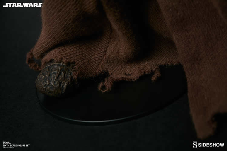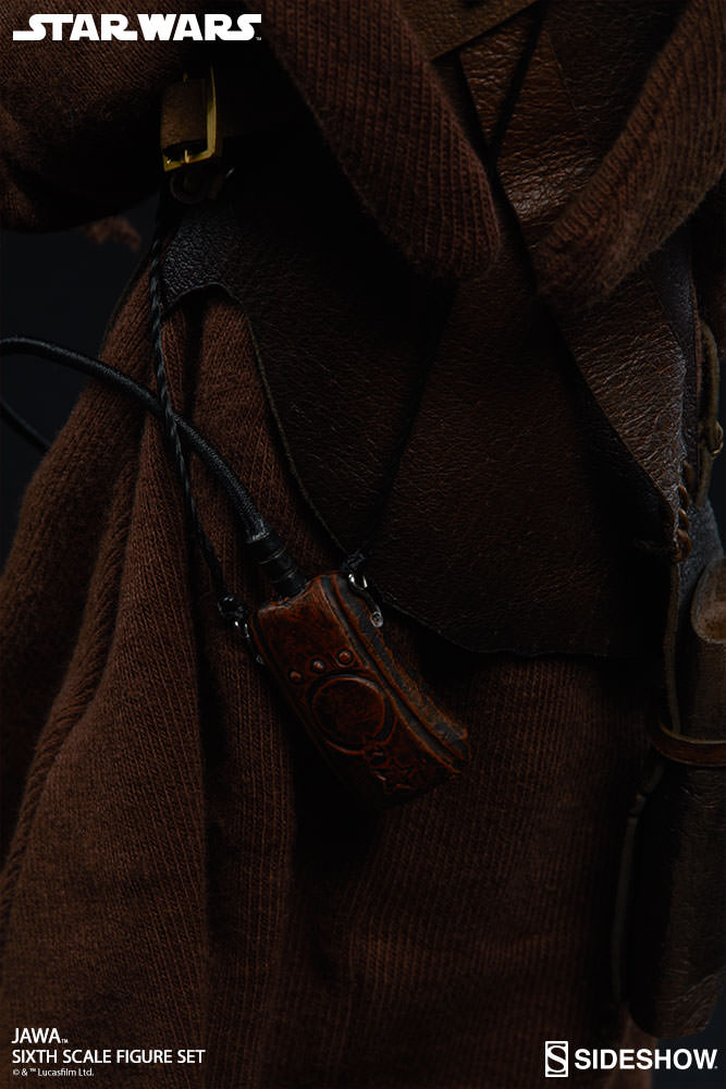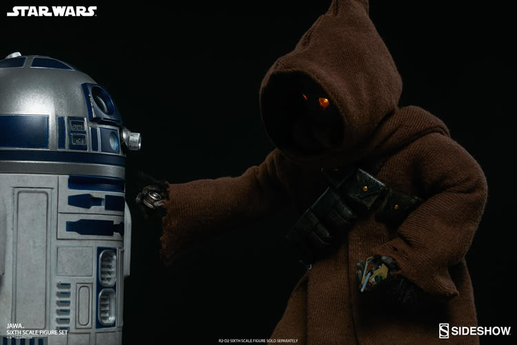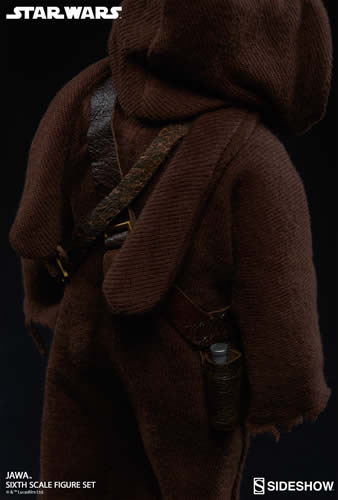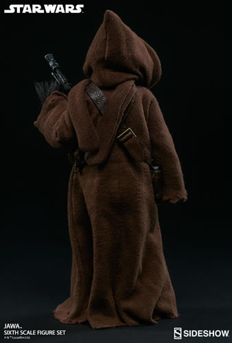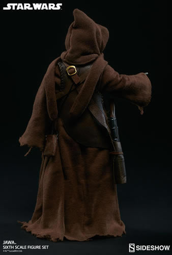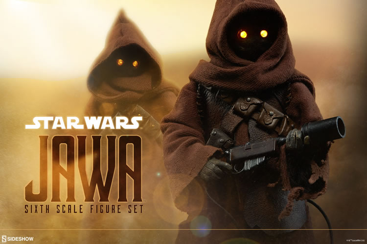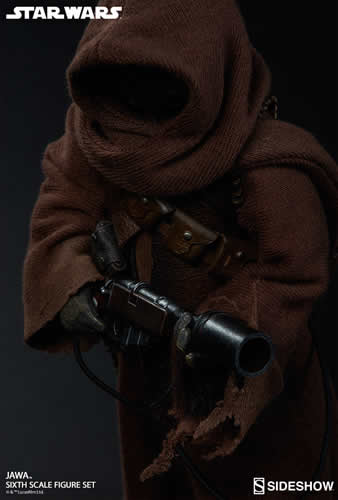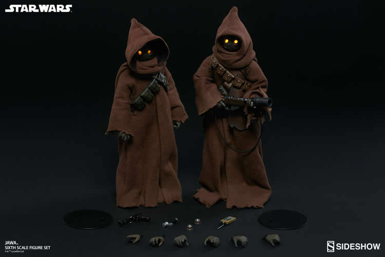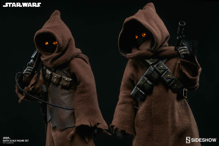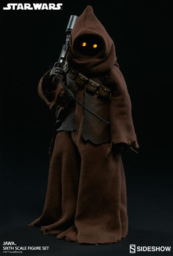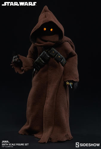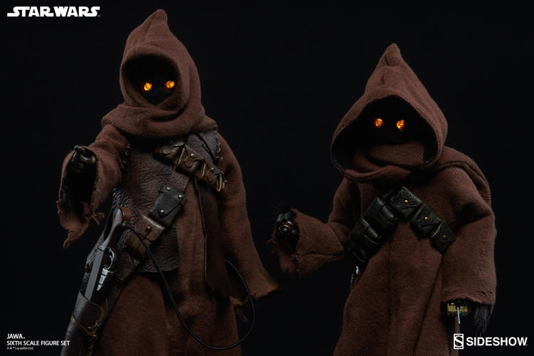 A curious species, bands of greedy merchant Jawas scour the deserts of Tatooine for discarded droids and scrap machinery to repair, trade, and resell. Never seen traveling alone, the Sideshow Collectibles Jawa Sixth Scale Set includes two fully articulated individuals, each packed with personality and the ability to pose in an endless variety of positions for display. Mysteriously concealed in their traditional brown robes and bandoliers, bright LED-illuminated yellow eyes peer out from beneath the dark folds of their peaked hoods. Ready to peddle their hastily refurbished finds, the Jawas are equipped with an impressive cache of weapons and accessories, including a space thermos, welder, droid caller, magnetic restraining bolt, a blaster pistol which fits neatly in a belt holster, and a droid-stunning Ion Blaster for difficult acquisitions. Scum, villainy, and moisture farmers alike will be hard-pressed to find a better selection anywhere else!