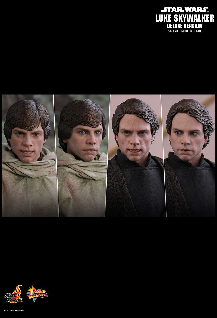Masterfully crafted based on the appearance of Luke Skywalker in the final chapter of the original trilogy, this collectible figure features a newly developed head sculpt with remarkable likeness to Mark Hamill, finely tailored costumes, the helmet and camouflage cloak Luke wore on Endor, a LED light-up lightsaber, an interchangeable lightsaber blade emulating the weapon in motion, a blaster, and a themed figure stand. This Deluxe Version will exclusively include an additional head sculpt with an interchangeable all-new hair sculpture, an interchangeable battle-damaged right hand, a dark grey tunic with belt, and the Tatooine sandstorm goggles and cloak as seen in the deleted scenes.