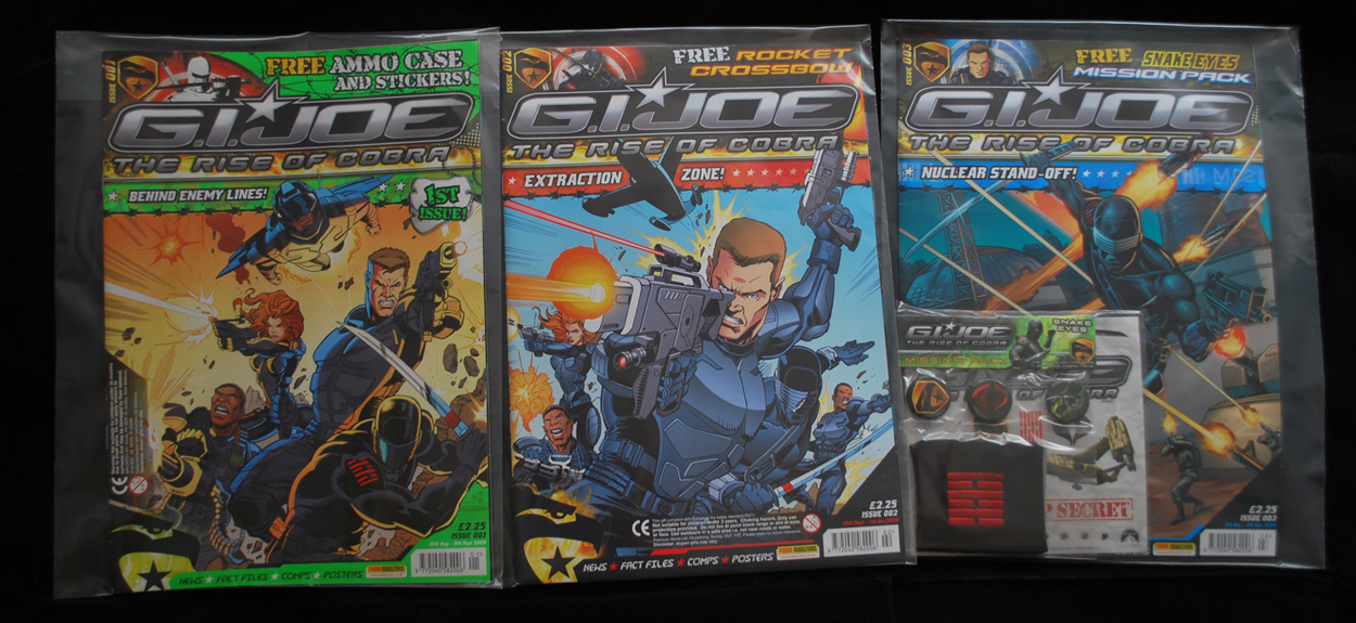 This set is in excellent condition. All toys are still sealed and have been carefully removed from the comic covers apart from the Snake Eyes Mission Pack - Issue #3 which is still attached.