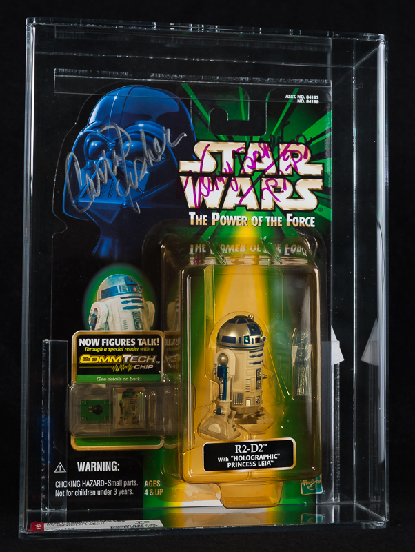 This is the Holographic Leia with R2D2 release which has been graded by AFA. The bubble has yellowed and the card has been hand signed by Carrie Fisher (Princess Leia) & Kenny Baker (R2D2) which is the reason for the 70 card grade. The Clebration II Star Wars card is on the outside of the case.