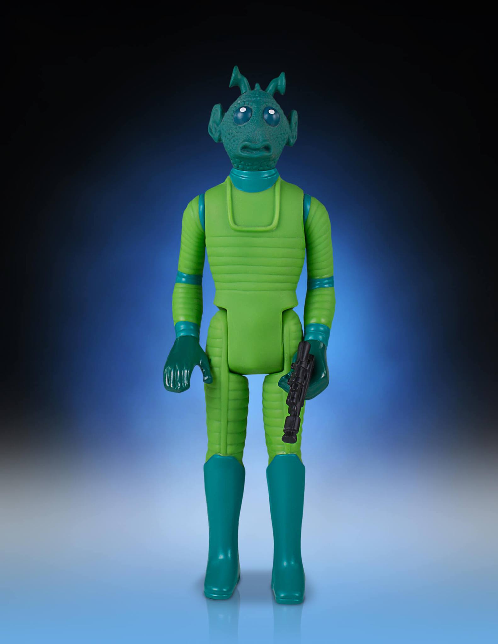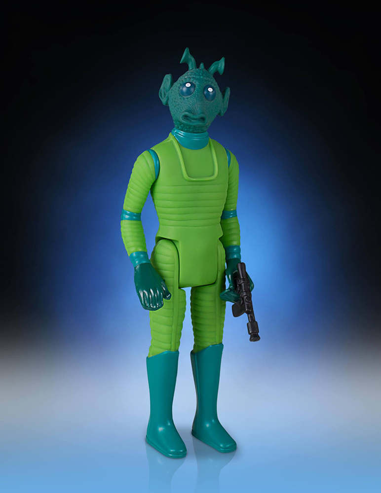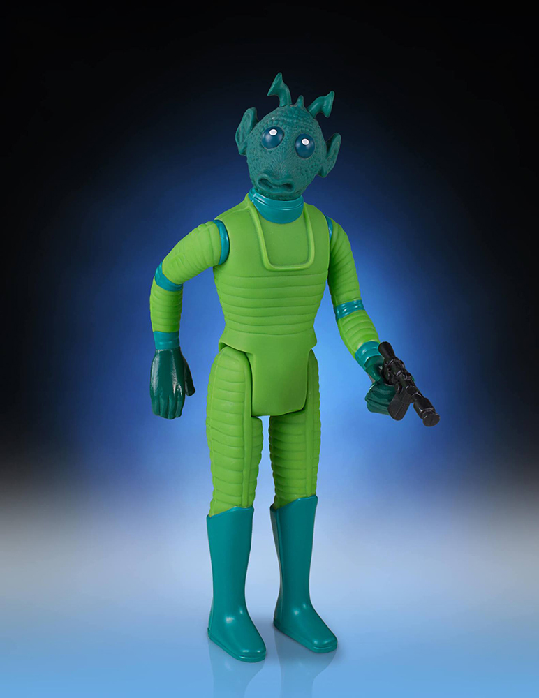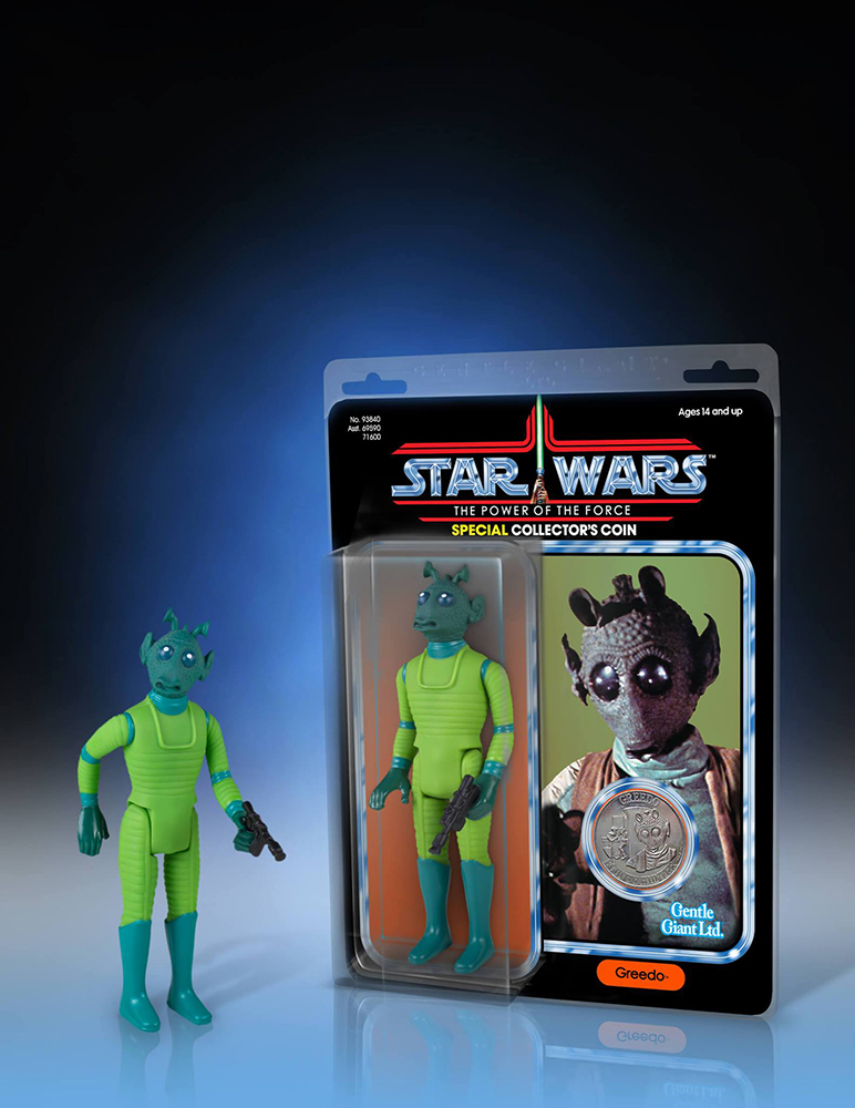 Gentle Giant continues on with their hugely collectible line of vintage Star Wars action figure reproductions with the Power Of The Force Greedo! Though prototyped and photographed by Kenner in 1985, the line was subsequently canceled. Over 30 years later, collectors finally have a chance to add an accurate example the early 80's Greedo to their collection. Digitally scanned from mint 3 3/4" vintage originals and reproduced in scale to the rest of the jumbo figure line. Nothing has been overlooked. Roto and injection molded and made of durable plastics, this fully-articulated jumbo figure includes a faithfully reproduced Blaster and monochromatic, color-matched lime green jumpsuit, just like you remember. That's not all, this classic vintage creation comes packaged on a re-sealable 1984/85 Power of the Force-inspired blister card, with original photography, artwork and featuring a replica 3"³ scale, metal, Power of The Force collector coin.
