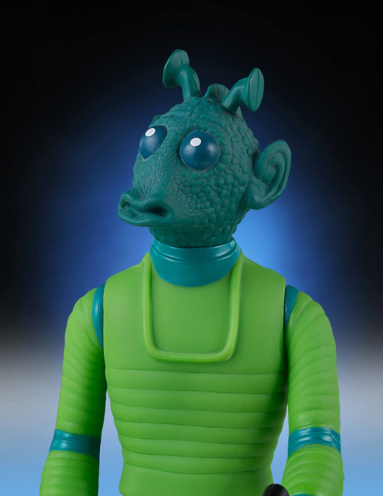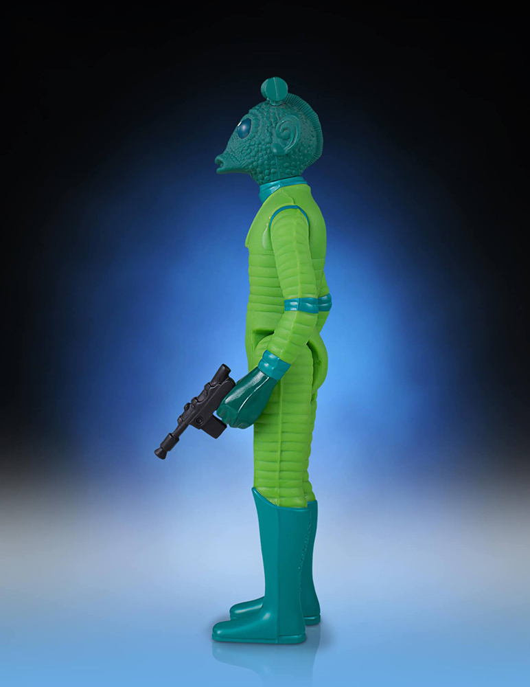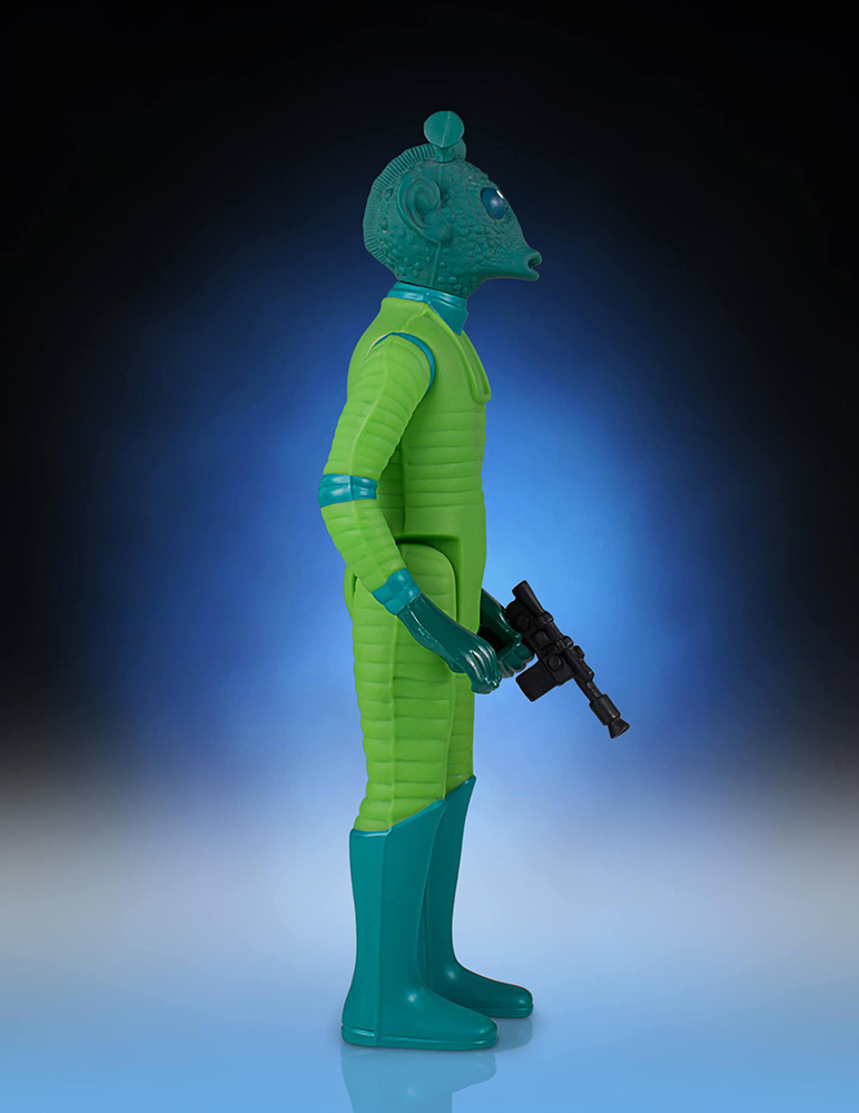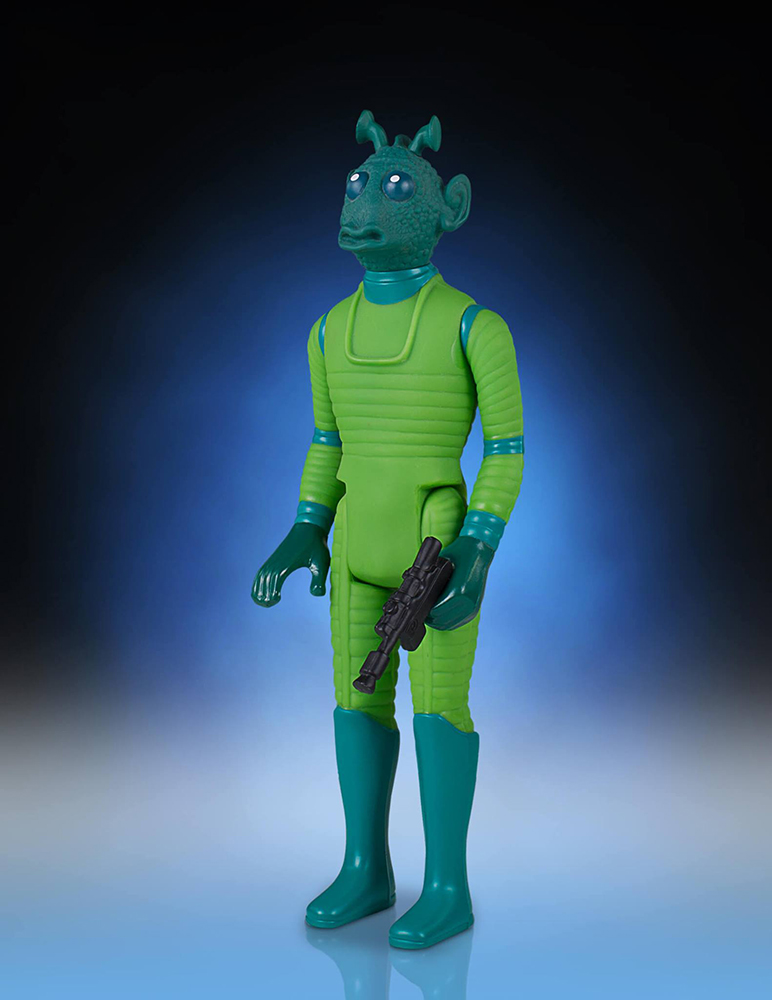 Gentle Giant continues on with their hugely collectible line of vintage Star Wars action figure reproductions with the Power Of The Force Greedo! Though prototyped and photographed by Kenner in 1985, the line was subsequently canceled. Over 30 years later, collectors finally have a chance to add an accurate example the early 80's Greedo to their collection. Digitally scanned from mint 3 3/4" vintage originals and reproduced in scale to the rest of the jumbo figure line. Nothing has been overlooked. Roto and injection molded and made of durable plastics, this fully-articulated jumbo figure includes a faithfully reproduced Blaster and monochromatic, color-matched lime green jumpsuit, just like you remember. That's not all, this classic vintage creation comes packaged on a re-sealable 1984/85 Power of the Force-inspired blister card, with original photography, artwork and featuring a replica 3"³ scale, metal, Power of The Force collector coin.