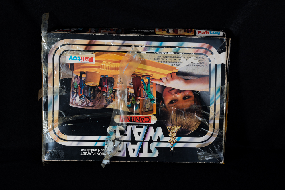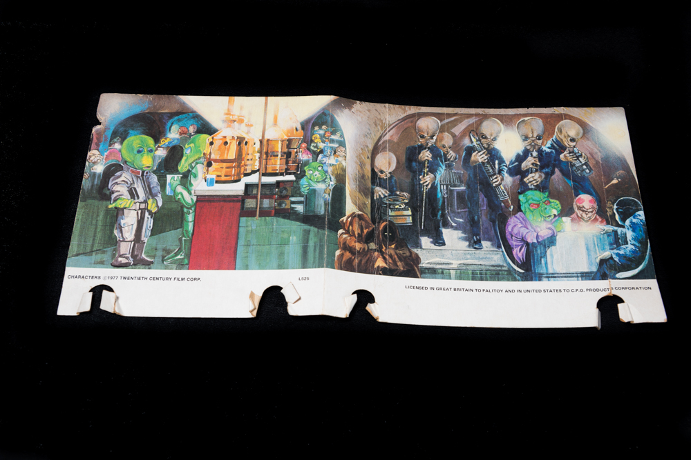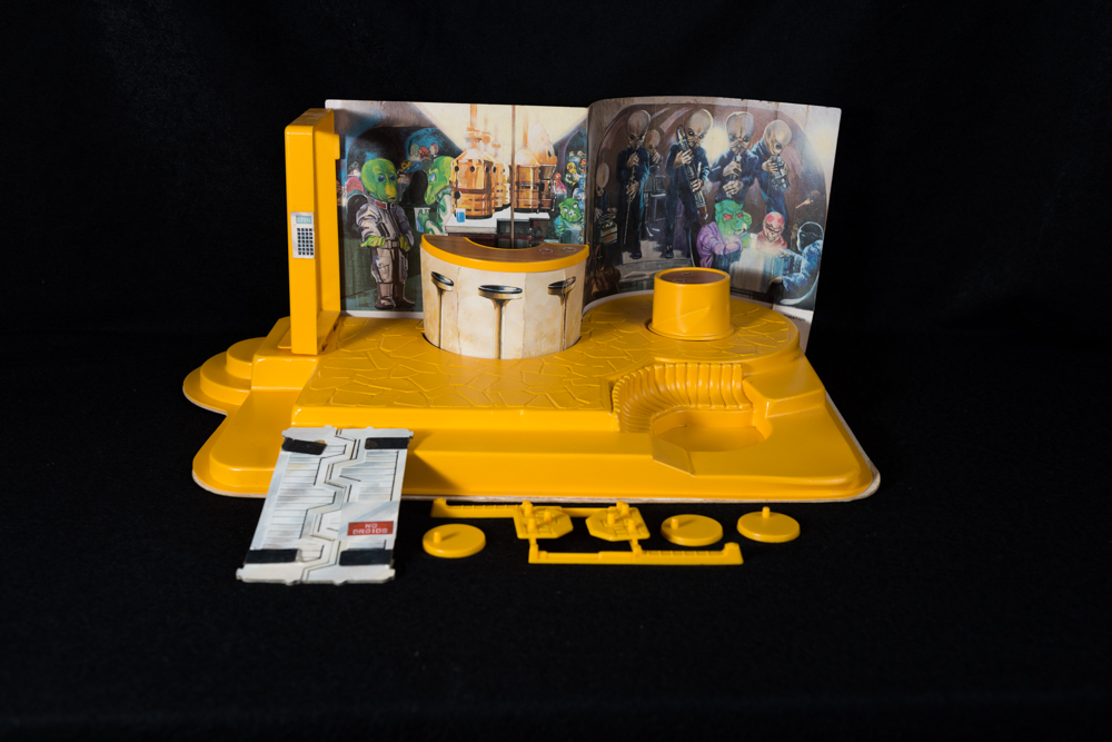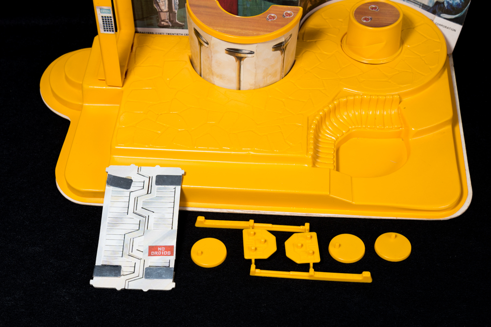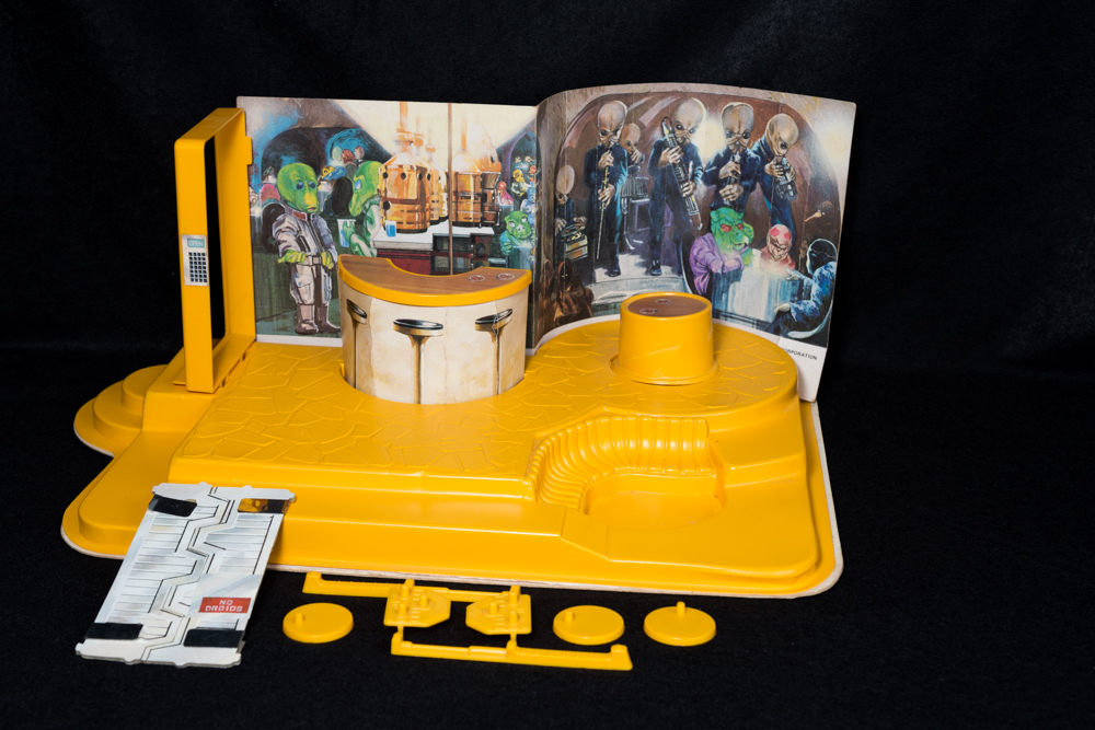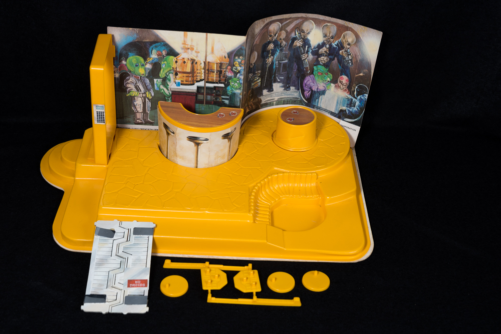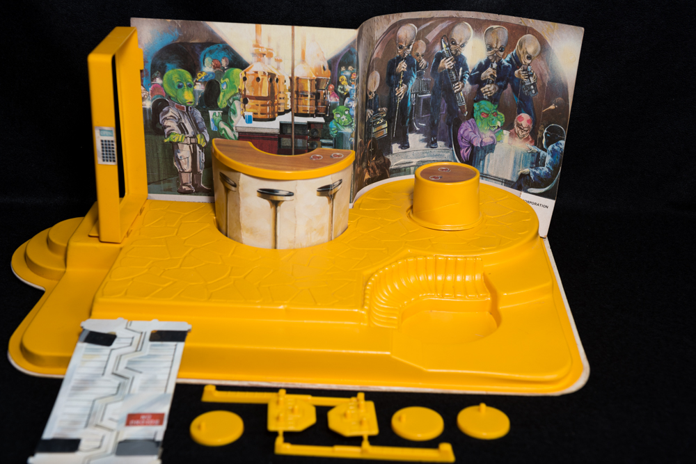 The box is in poor to fair condition showing signs of wear and tear. The Cantina doors are not attached to the door frame and the Cantina backdrop has wear on the insert tabs. Overall the playset is in good complete condition minus instructions