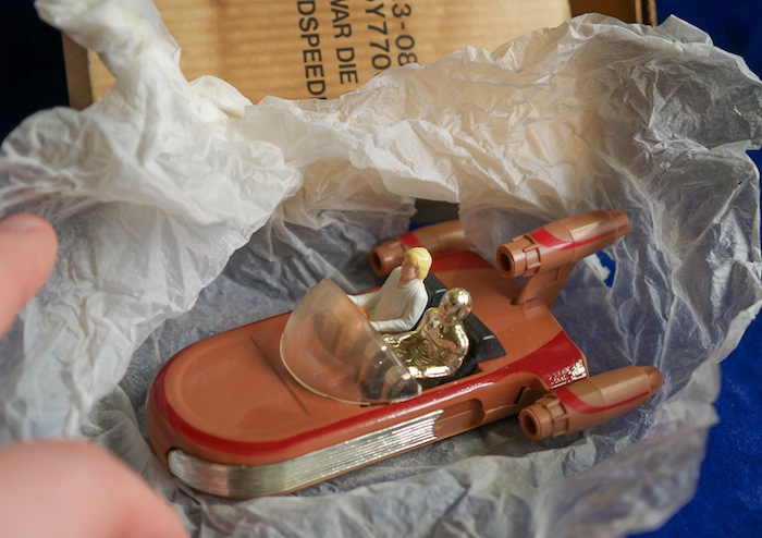 This is the 1978 mail order Landspeeder which came packaged in just the brown box with tissue paper sometimes including a small Star Wars catalogue inside. This particular piece has not been printed with "Star War Landspeeder" that many other boxes are marked with. The picture of the open Landspeeder shown is an example for you to see as this item is still factory sealed.