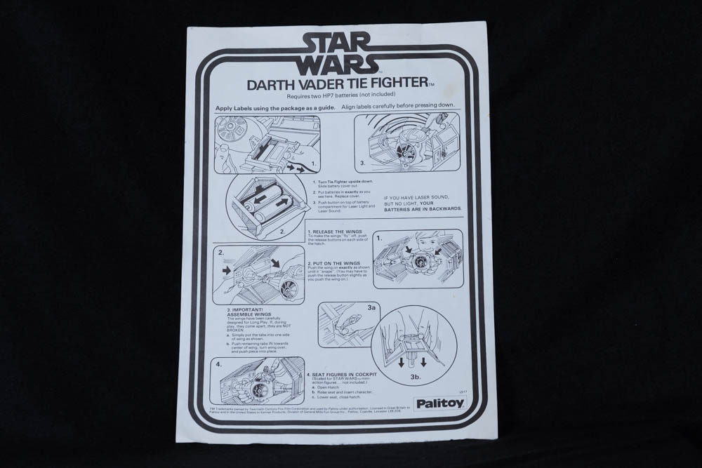 The Tie Fighter is in very good condition. Original stickers are still attached and the exploding wing mechanisms are in full working order. The electrics have not been tested. Also comes with the Palitoy instruction sheet.
