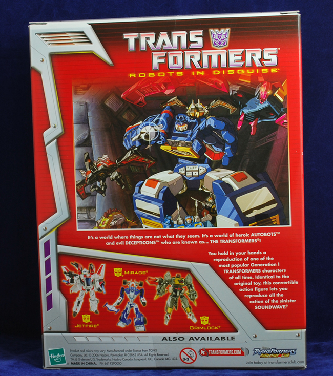 It's a world where things are not what they seem. It's a world of heroic Autobots and evil Decepticons who are known as The Transformers! You hold in your hands a reproduction of one of the most popular Generation 1 Transformers characters of all time. Identical to the original toy, this convertible action figure lets you reproduce all the action of the sinister Soundwave. It is said Soundwave can hear a fly sneeze. Uses anything he hears for blackmail to advance his status. Opportunist. Despised by all other Decepticons. Sensors can detect even lowest energy radio transmissions. Able to read minds by monitoring electrical brain impulses. Acts as radio link for others. Locates and identifies Autobots, then informs Decepticons. Carries a concussion blaster gun. Often target of retaliation by his comrades.